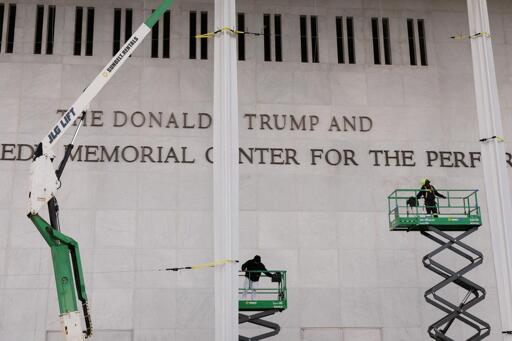 Workmen on scissor lifts added metal lettering to the building’s facade, before dropping a blue tarpaulin to reveal the sign saying “The Donald J. Trump and the John F. Kennedy Memorial Center For the Performing Arts.”