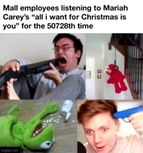betterworse if you hear it at a dead mall, with hardly anyone around and almost no open stores.mine is rockin’ around the christmas tree. my senior year of high school, the freshmen were pranking me with it. every hallway, i’d turn a corner and they’d see me, press play and “ROCKIN’ AROUND … THE CHRISMAS TREE! HAVIN A HAAPYYYY HOOOLLLIDAYY” on your mothers graves if i never hear that song again i’ll die happy