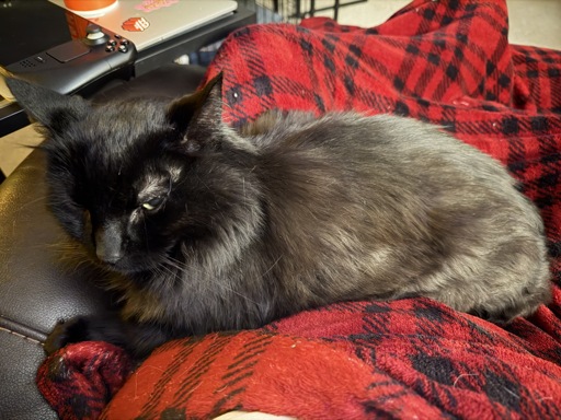 If I’m sitting somewhere, especially if I’m wearing a blanket? He’s gonna be there. He will make himself comfortable, making happy kitty noises the whole time. Foot goes numb? Well, just gotta wait it out! My lap is a bed now.
