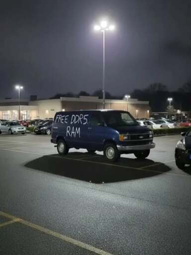 The photo is a blue van in dark parking lot. On the side of the van it says “Free DDR5 RAM.”