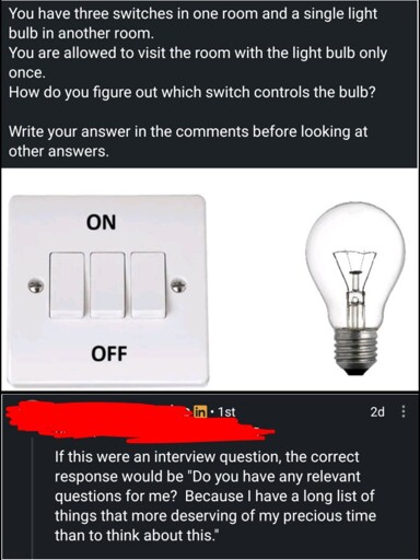 Flip two switches and check the bulb. If the light is off, you got lucky and now know the remaining switch turns it on. If the light is on, you now know one switch that won’t turn it on. Return to the room and finger your asshole. You’re now having more fun than solving a logic puzzle.