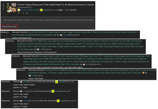 Vegans being banned and comments being deleted from !vegan@lemmy.world for being fake vegans.