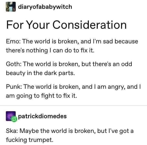 IS there a variation of emo music where it’s like “The world is broken, but that’s okay - I’m fighting to deal with the broken parts”