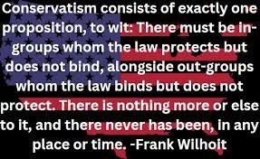 Conservatism consists of exactly one proposition, to wit: There must be in-groups whom the law protects but does not bind, alongside out-groups whom the law binds but does not protect.