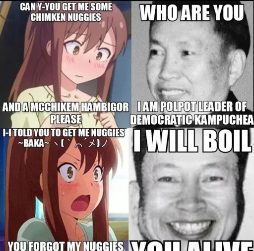 Anime girl wants chicken nuggets but little does she realise that the person she is demanding chicken nuggets from is the infamous Cambodian dictator Pol Pot.