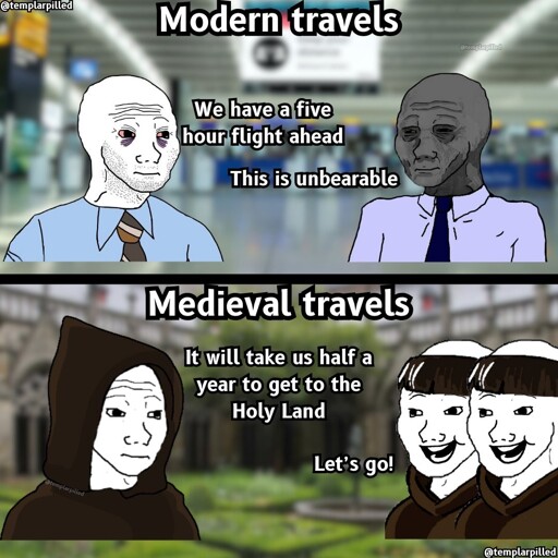 And finally, time. People here seem to think like medieval people travelled for 6 months just for funsies. But no, this is not like taking a year long vacation. For one thing, the other two reasons above - your life is going to be very shitty for basically the whole time, and you might just die due to an ill-tempered musselman or an evil jew witch cursing you to shit blood. But also, you are giving up the opportunity to do anything else to improve your life or the life of your family for a whole year. Your mom could get sick and die. That sexy somebody you keep making eye contact with could marry someone else. The part of the community crop land you’ve been angling to get assigned to your family will get snaked by Bill - of course. Fucking Bill. What a dick. And really, until you show up again, no one is going to do anything to help you out because, again, there is a good chance you die on your trip.
