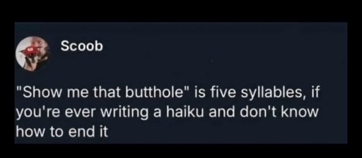 minus-squarezout@fedia.iolinkfedilinkarrow-up5·4 days agoWhere cripples can see, And the blind can walk again, Show me that butthole.