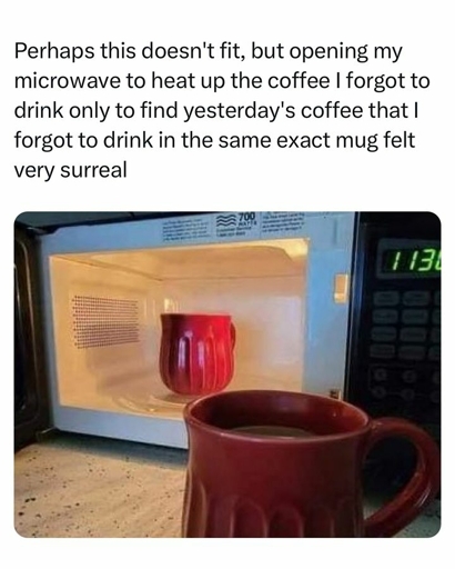 This was my coworker at my old job. I’d go to open the microwave to reheat my lunch and find her coffee cup there from earlier. It became a running joke whenever she couldn’t find something to check the microwave.