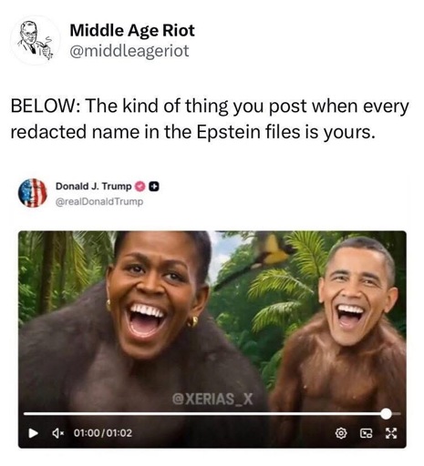 You’re not wrong, and playing a video feed of chimpanzees while Democrat representatives are speaking is dumb, but I imagine it was a mix of colors and genders. Putting the former PoC president and his wife’s faces on fucking apes is another level. It’s a very old, very specific, and very intentional act of racism…