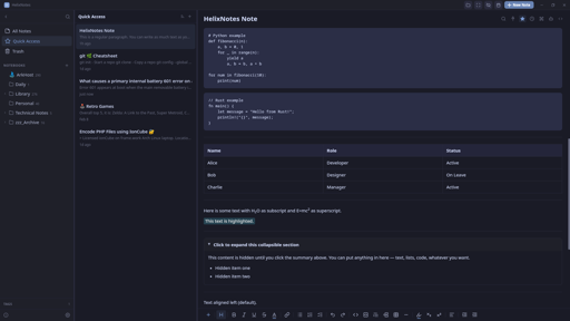 Obsidian’s default editor is barebones, you need plugins to get a usable experience. HelixNotes gives you rich editing out of the box: formatting toolbar, slash commands, source mode toggle. No setup. It’s also not Electron. Rust + Tauri 2.0 & Svelte fraction of the RAM, launches instantly. Same philosophy though: local .md files, no cloud, no lock-in. If Obsidian works for you, no reason to switch.