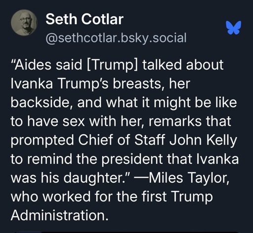 Yeah there’s no way he didn’t rape his daughter. When he says shit like that it’s almost like he’s trying to see how others react to the idea that he fucks his own daughter.