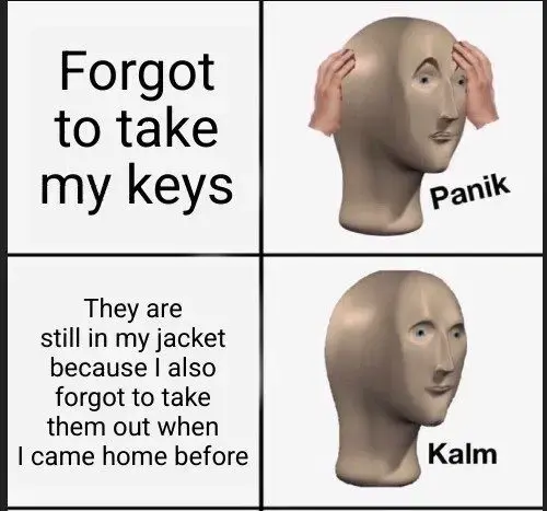 minus-squaretasho@leminal.spacelinkfedilinkEnglisharrow-up1·11 days agowow this just happened to me too lol. I thought I lost my keys so I used the hidden outdoor key instead. and then I lost that key too. but lo and behold, my keys were in my jacket and the outdoor key was just buried in the dirt.