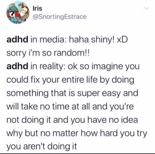 Even ADHD-oriented media is often being dishonest with people who suspect themselves to have this condition, being toxicly positive and showing ADHD as a “superpower” as if you can hyperfocus your way to success. It is neither a gift nor even an equal exchange between advantages and drawbacks like “you’ll be always late but also always creative!” It’s a crippling thing that may ruin career or end a relationship. There is nothing good with ADHD.