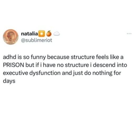 Self imposed structure feels as effectively authoritative as a cardboard cutout but externally imposed structure is suffocating 🫠