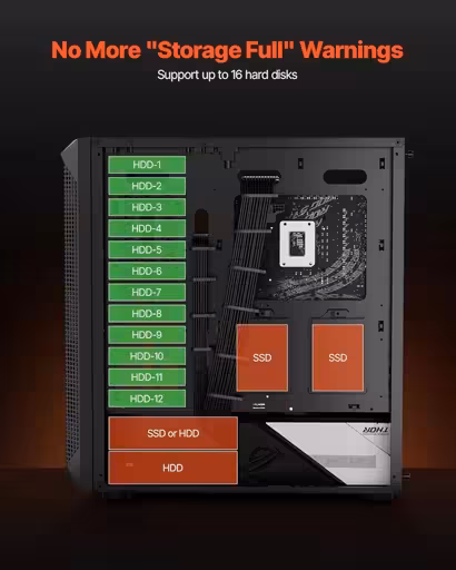I run 4 x 8Tb SSDs, not cheap, but solid, low power AND low heat (even more important).