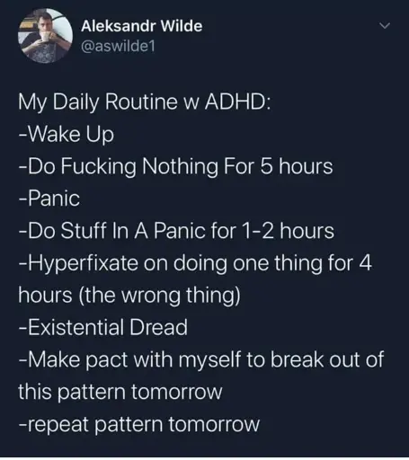 arrow-up18arrow-down1imageFor sure tomorrowlemmy.zipCluelessDude@lemmy.zip to ADHD memes@lemmy.dbzer0.comEnglish · 2 years agomessage-square16linkfedilink
