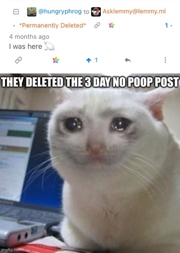 For newer users, the 3 day no poop post was an legendary asklemmy post where OP asked how they could go three days without shitting. We never found out why.