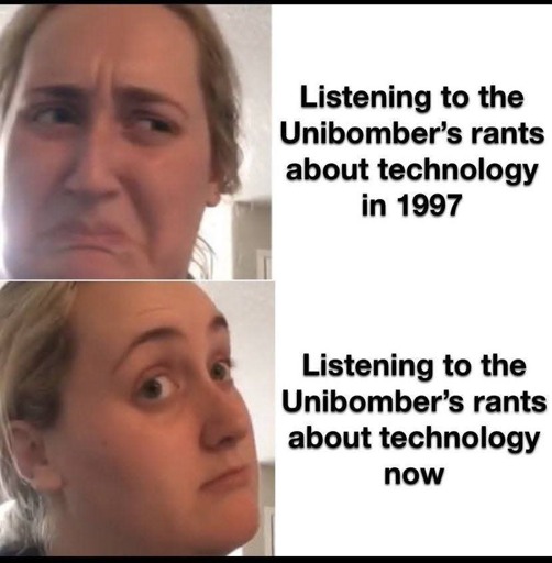 arrow-up1956arrow-down1imageThe unAbomber. Otherwise, I agree.lemmy.worldMTZ@lemmy.world to Lemmy Shitpost@lemmy.world · 12 days agomessage-square169linkfedilinkcross-posted to: [email protected]