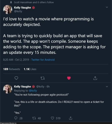 Not programming, but the plot of Shin Godzilla was about bureaucratic red tape holding back the actual solutions.