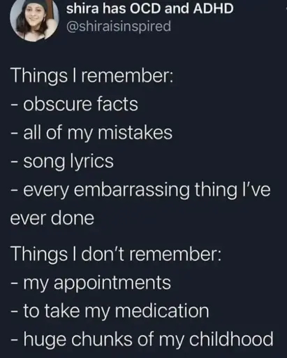 Same same but I can’t remember huge chunks of my adults life. I chat with family and friends and they recall stories of things we’ve done together and I don’t remember anything. It helps if I see a photo but sometimes I still can’t recall anything and it just freaks me out.