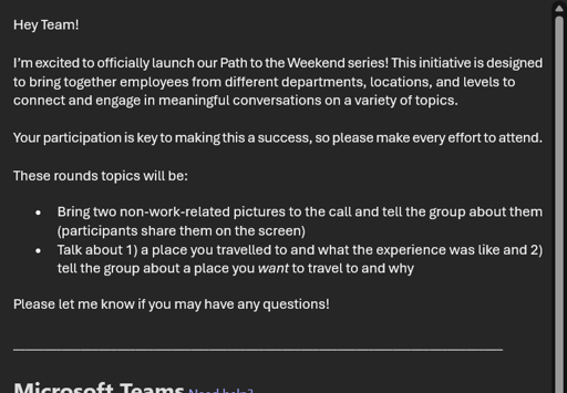 “I’m a private person and don’t feel comfortable sharing. Thanks for the invite, but I’ll be turning this meeting down. Feel free to reach out if you have any work related discussions in which my opinion would be valuable. I have lots of ideas for improvement for cross-department collaboration that I would be willing share.”