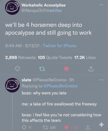 If you’d budget your time more wisely to arrive an hour early to work every day, you would’ve been here before the lava consumed the freeway.