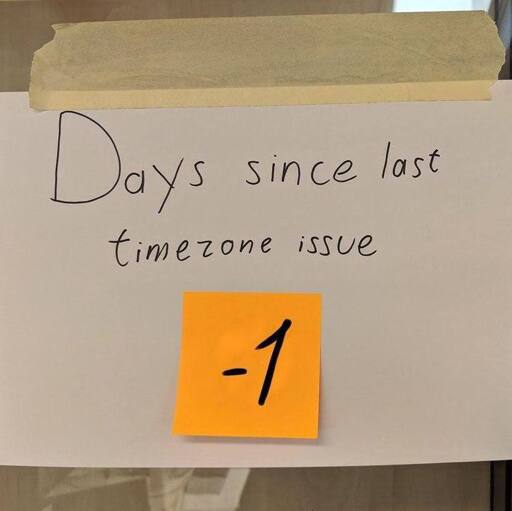 arrow-up1881arrow-down1imageDays since last timezone issuelemmy.mlcm0002@lemmings.world to Programmer Humor@programming.dev · 7 days agomessage-square20linkfedilink