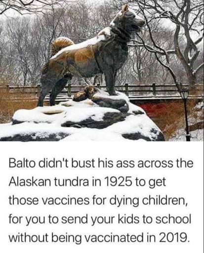 Fuck that. Balto’s owner was the asshole. Balto himself and his team were sold and spent years malnourished and chained to a sled in a freak show wondering what they did wrong, and when they were finally “rescued” they wound up in a zoo. Well fed, but in cages while people gawked at them. Balto watched the rest of his team die one by one until he himself died blind and paralyzed.