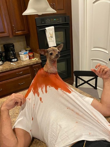 A picture of a man laying on a kitchen table wearing a white T-shirt. There is a large bloody stain on his chest and a chihuahua is bursting through the hole in the shirt like a chest-buster from the movie Aliens.