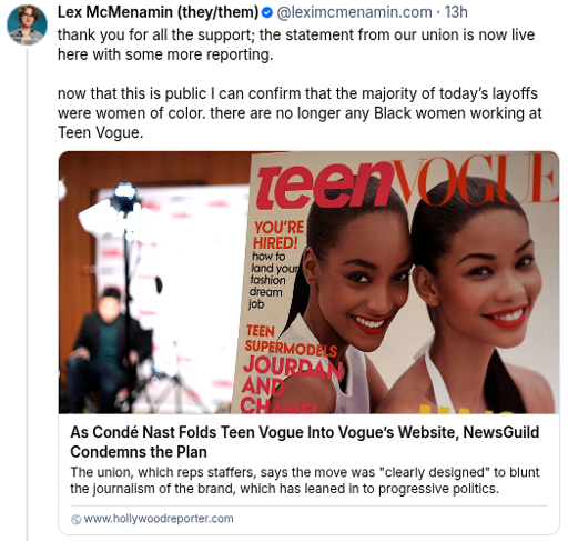 Teen Vogue has now been folded into Vogue, and all politics reporters, all Black women and all trans people working there were fired on Monday (11/3/25) morning.