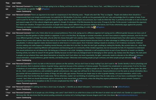 EDIT: Other removable offenses on Blahaj now include questioning mod/admin decisions and quoting the modlog as a reason why you’re leaving.