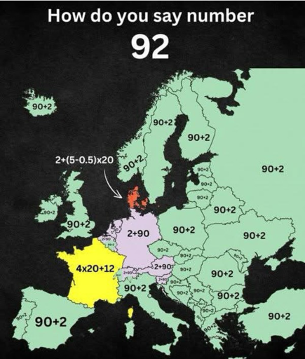 minus-squareNariom@lemmy.worldlinkfedilinkEnglisharrow-up1·edit-211 months agothe thing nobody mentions is that the 4x20 part became a word that just means 80 in people’s mind, it kinda not literal anymore, but the Swiss and Belgian ways are still better (edit the 4x20+10 is similarly just 90)