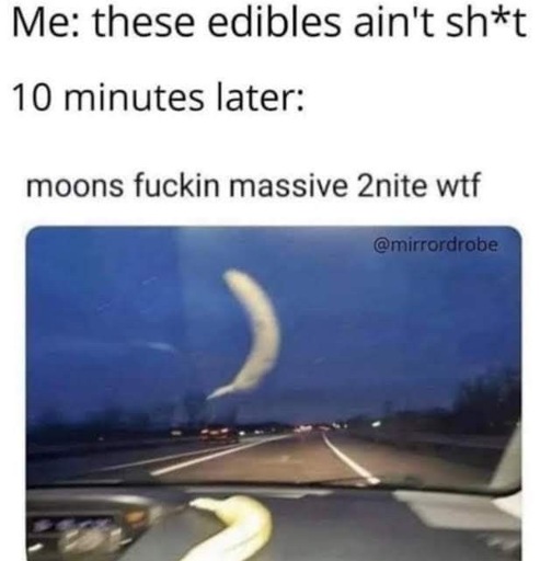 A picture of a banana on a car’s dashboard, the banana is being reflected in the windshield, making it look like a big waxing moon. The caption reads “Me: these edibles ain’t shit. 10 minutes later: moons fuckin massive 2nite wtf”