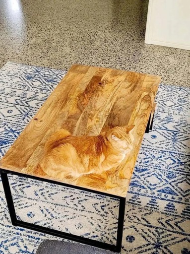 A picture of an orange cat lying on a wooden coffee table; the table is the same color as the cat, making the cat almost invisible.