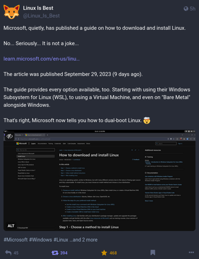 Timely_Jellyfish_2077@programming.dev to Linux@lemmy.mlEnglish · 2 years agoMicrosoft published a guide on how to install Linux.programming.devimagemessage-square6linkfedilinkarrow-up17arrow-down11