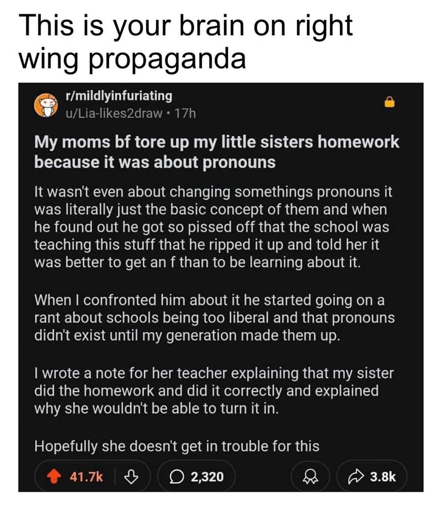 Imagine being so scared of pronouns that you tear up a little kid’s English homework. Like, can you really be that dense? What’s next, Adjectives?!