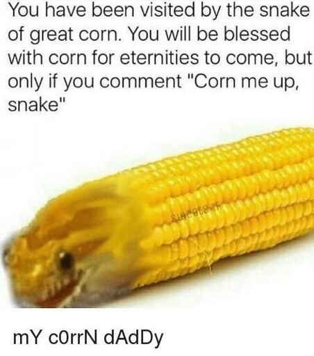 Corn is so awesome! I love corn. So please, corn me up, snake of great corn. 🐍🌽