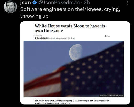 So how do we measure time on the moon in a way that isn’t completely insane? The only logical thing I can think of is to fundamentally lock the time zone of the moon to the earth. That the date, and maybe even the time, isn’t based on the moon, but rather transposed from some definition of the same on earth.