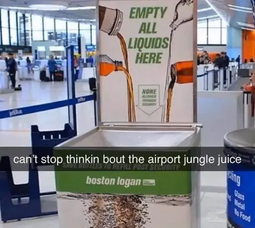 My dad worked at Gatwick Airport as a cleaner in the 70s when he was a teenager. His first week there, a woman drops a duty free bag with a bottle of booze in it and he rushes over to clean it up. He’s just about to put the bag, full of liquid booze and broken glass, in the bin when one of the senior porters stops him and tells him to bring it in the back. Turns out they had a filtration system in the break room for this exact scenario. They’d pour the booze out of the plastic bag and through a sieve that would collect all the broken glass, it would all go into a big container at the bottom and voila, free booze! They offered my dad some, but he declined. Anyway, I guess if you were working at Gatwick in the 70s you could have had a chance to drink some airport jungle juice, you’d just need to be brave enough.