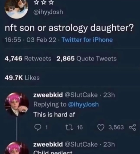 Well there is the Nazi version of nft sons… So… I guess even then… I guess… I take the Nazi astrology daughter… And then I blame myself for being a bad parent who failed to teach them properly morals.