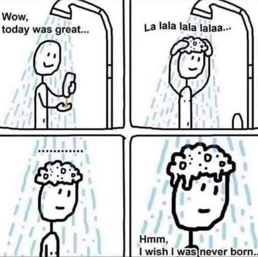 Looks like that shampoo seeped into his brain and made him instantly depressed & forget what a great day he just had.