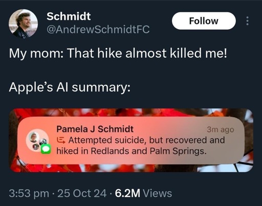 I mean also AI summarizing conversations is a useful feature as long as you view it as what it is. Potentially one of the few examples where an LLM is actually useful. My family has an ongoing group chat that is constantly just dumb shit; some days just 100 messages ranting about something or other, but sometimes there’s something worth seeing like events and the like. Trusting AI to glean all the information properly is dumb. Being able to use it to quickly grep what’s happening before doing your own reading isn’t.