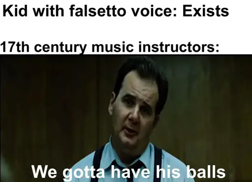 There’s a hentai doujin based on this. A guy wants to be in the church choir but he needs to lose his balls to join so a nun cuts his whole dick off and then fucks him with it. I’ve no idea what it’s called as I read it years ago.