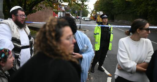LONDON — Police declared a terrorist incident after two people were killed and four others were seriously injured on Thursday when a man rammed a car into a crowd and stabbed people at a synagogue in the northern English city of Manchester.