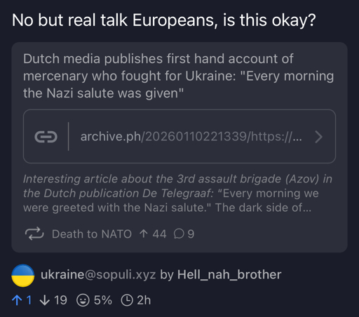 15·16 days agoBelieve it or not, I have a real actual life outside the internet. Is checking the transcript of my personal interactions with people a good metric to understand geopolitics?