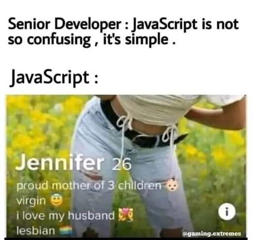 arrow-up1-1arrow-down1imagePick a side Javascriptlemmy.worldalphacyberranger@lemmy.world to Programmer Humor@programming.devEnglish · 2 years agomessage-square0linkfedilink